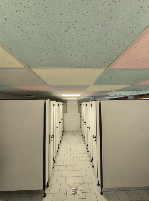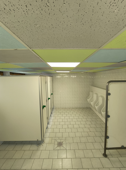 An zwei Tagen in den Osterferien wurden die Toiletten verschönert, indem man die Deckenplatten farbenfroh gestaltete. Ein erster Schritt um den tristen Räumen eine freudige, abwechslungsreiche und belebte Atmosphäre zu verschaffen. Das Ergebnis kann sich doch sehen lassen, oder?!
